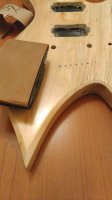 あと、ハイポジションでも邪魔にならないようにネックのジョイント部分が削ってある所為もあってか、ビス穴の位置が変えてある。ネックのビス穴を開けなおさないとアカンなあ。
